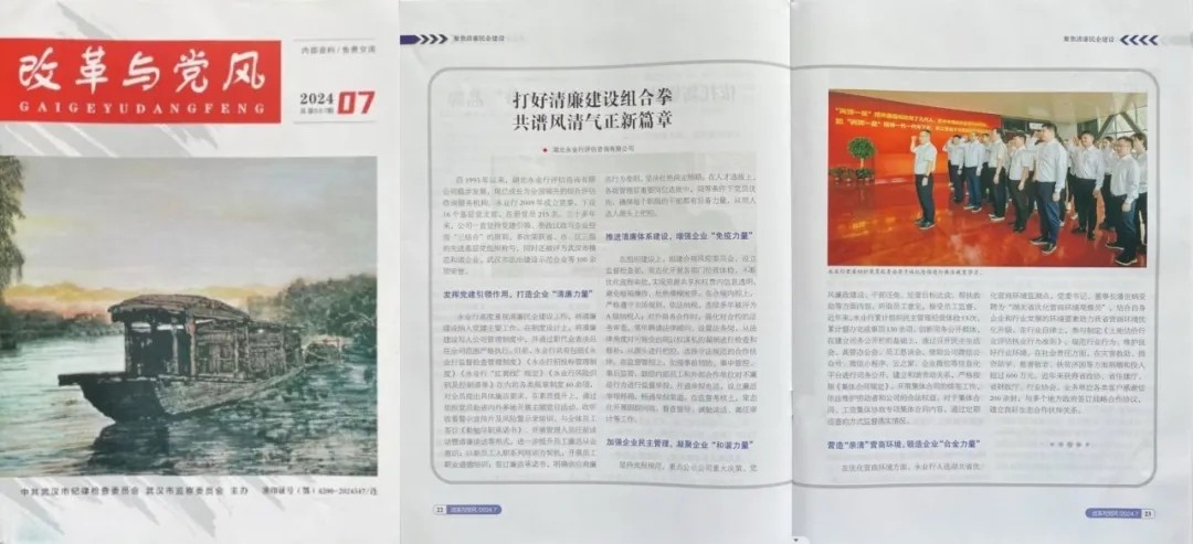 近日,中共武汉市纪律检查委员会、武汉市监察委员会主办的杂志《改革与党风》,刊发《打好清廉建设组合拳 共谱风清气正新篇章》文章,宣传介绍了永业行坚持以党建为引领,多措并举推进清廉企业建设的实践和经验。 多年来,永业行始终将清廉建设与企业经营管理深度融合,通过发挥党建引领作用、推进清廉体系建设、加强企业民主管理、营造“亲清”营商环境,打好清廉建设组合拳,共谱风清气正新篇章。永业行多次荣获省、市、区三级先进基层党组织称号,入选湖北省优化营商环境监测点,先后获评武汉市清廉民企创建示范单位、武汉市法治建设示范企业、武汉市模范和谐企业等100余项荣誉,并在武汉市清