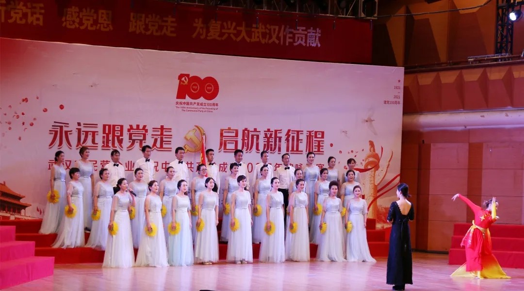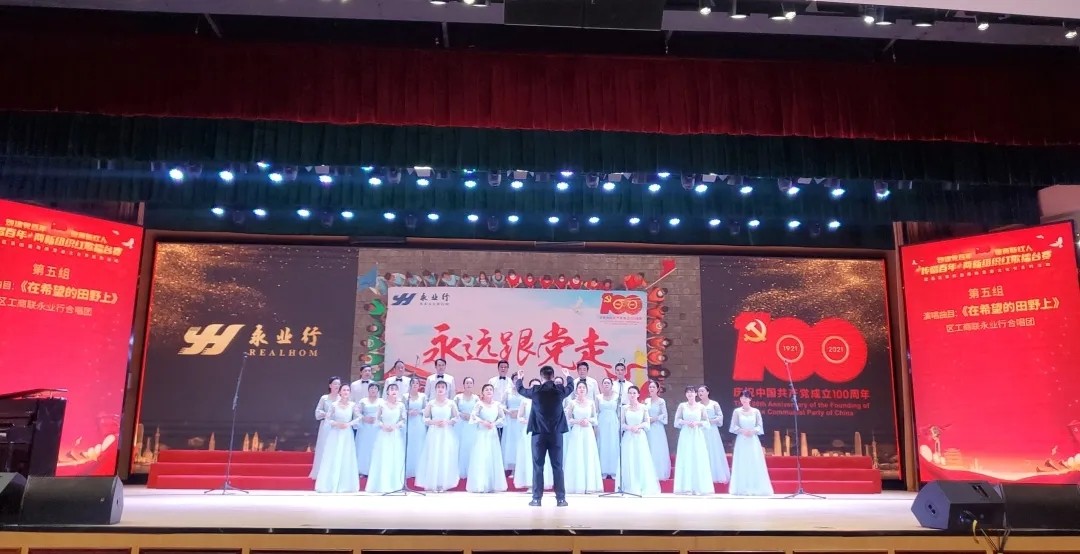 百年风雨沧桑,百年壮丽辉煌,我们迎来了中国共产党的百年华诞。6月25日下午,由武汉市委统战部、市工商业联合会举办的“武汉市民营企业庆祝中国共产党成立100周年歌唱比赛”在市青少年宫音乐厅隆重举行。在武昌区工商联会员企业党委的推荐下,永业行合唱团与来自全市各区工商联、工商联所属商会、会员企业的15支队伍纵情高歌,唱响红色经典。永业行合唱团以饱满的情绪深情献唱的经典歌曲《在希望的田野上》,以新颖的演唱形式、丰富的表演内容得到了专家评委和现场观众的认可,荣获比赛三等奖。 当天,红歌嘹亮,掌声如潮,一首首耳熟能详的红歌唱响了党的激情岁月,唱出了对党的热爱之情。省委统战部副