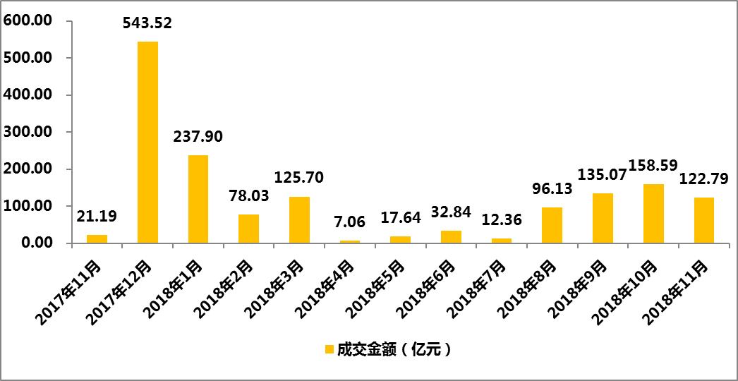 成交金额:11月成交金额达122.79亿元,环比下降22.56%,同比增长479.47%。