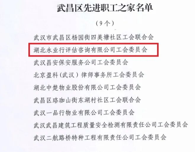 近日,武汉市武昌区总工会发布 《关于武昌区先进职工之家、先进职工小家评定结果的通报》 ,永业行获评武昌区先进职工之家。